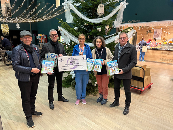 Le Cronos club a de la suite dans les idées. Comme en 2023 et 2024, l’association chaux-de-fonnière a financé la distribution de 400 exemplaires de la BD Boule à Zéro aux enfants hospitalisés en pédiatrie. Le mardi 16 décembre, Julien Dubois (2e depuis la gauche sur la photo) et Vincent Prati (tout à droite), membres de l’association, ont transmis symboliquement les cartons d’albums à Sabine Illide-Boulogne, sage-femme cheffe du département femme-mère-enfant, et Marie-Christine Chautems, ICUS de pédiatrie, sous le sapin du hall de Pourtalès.